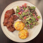 A simple meal since the salad was made ahead. I heated the bacon and the bacon/cheese egg bites (Kirkland brand from Costco) in the air fryer. The salad looks kind of muddy in the photo as I mixed in some leftover sweet and sour red cabbage which always turns whatever it’s added to pink!