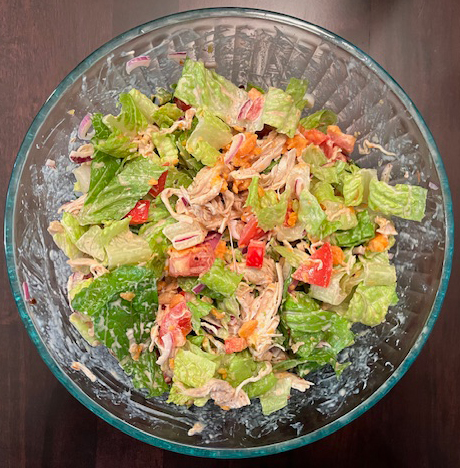 A big salad is such a versatile low-carb meal! This winter salad has Romaine lettuce, seasoned shredded chicken breast, a small amount of sweet potato, tomatoes, red peppers, red onion, salsa mayo, Aleppo pepper flakes and salt. I warmed up the chicken and sweet potato in the microwave.