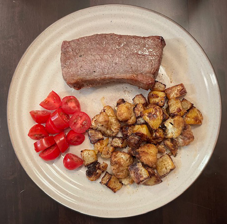 A lovely steak that was on sale at Safeway. I paired it with roasted cauliflower and rutabaga (swede) and a few baby tomatoes. Simple and easy! I used the air fryer for the roasted veggies and the steak (not at the same time).
